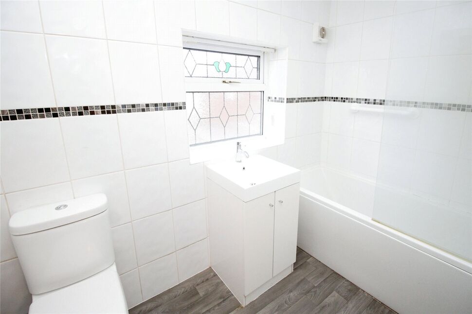 Having side facing double glazed window, three piece white suite comprising of, panelled bath with electric shower over, hand wash basin set in vanity unit and low level Wc. Tiling to walls and a heated towel rail.