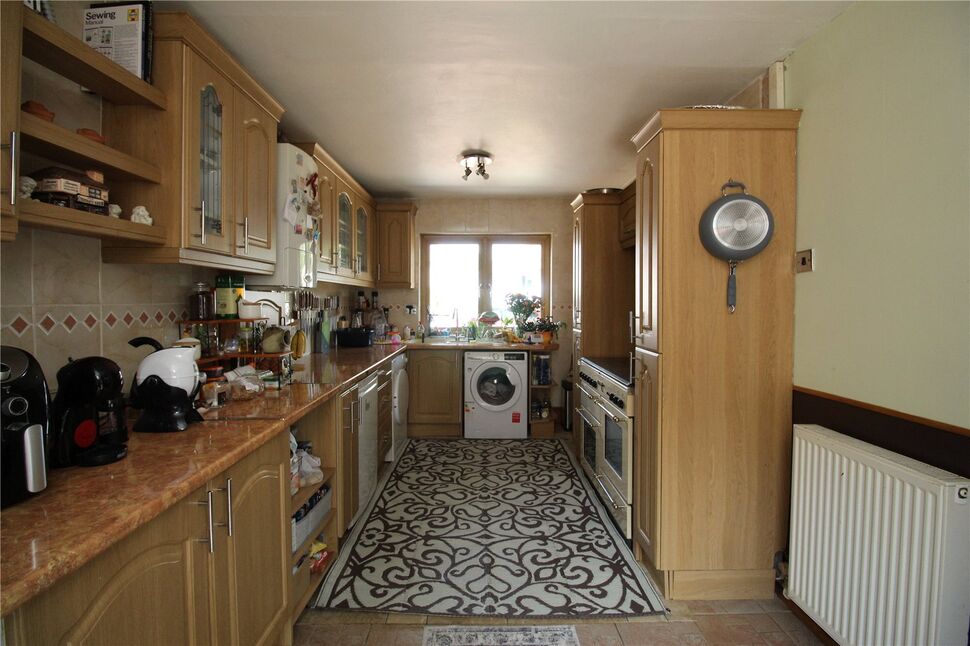 At the heart of the home is a large kitchen and dining area — perfect for family mealtimes and entertaining guests. This bright and airy space overlooks the rear tiered garden, offering a pleasant view and easy access to outdoor living.