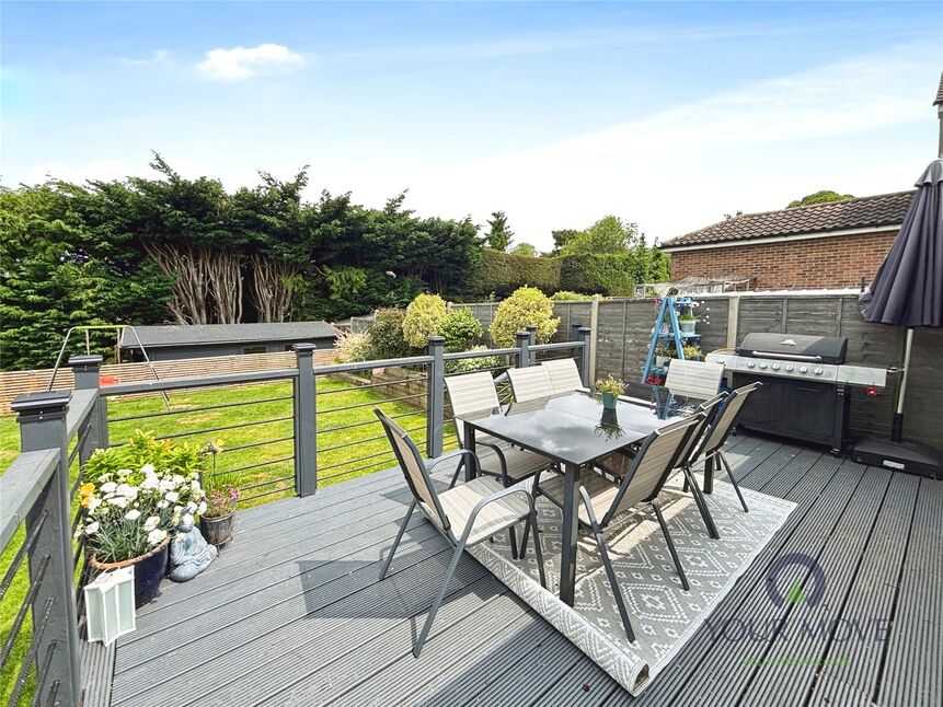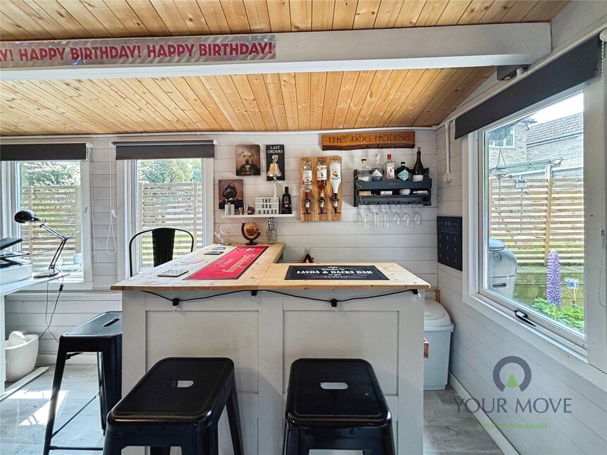 The reception room is inviting and spacious, providing a perfect setting for both relaxation and entertaining guests. Complementing the indoor spaces, the external features of this property are equally impressive. The beautifully maintained garden offers a decked area, ideal for alfresco dining or merely enjoying a quiet moment amid the greenery. Additionally, there's a grassed area and a second patio leading into the bar/home office. This versatile space is perfect for those who work from home or for entertaining friends and family.