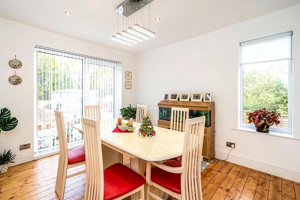 A separate dining room with sliding doors to access the rear garden. With wooden floorboards and neutral decoration.