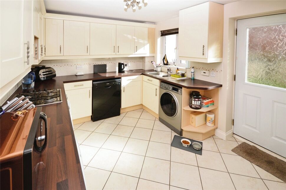 Fitted kitchen comprising a range of wall and base units with contrasting roll edge work surfaces, integral double oven with four ring gas hob and extractor hood, space and plumbing for a washing machine and dishwasher, wall mounted gas central heating boiler, under stairs cupboard, sink and drainer unit, tile splashbacks, composite door to the rear aspect and a double glazed window to the rear aspect.