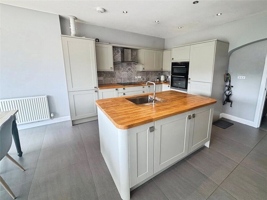 Stunning extended, breakfast kitchen with a good range of wall and base level units, providing cupboard and drawer space. Wooden work tops with matching island incorporating an inset sink with mixer tap. Built in appliances including a high level double oven, an electric hob with an extractor over and a fridge freezer. Beautiful tiled splashbacks and flooring. Spot lights to the ceiling, a central heating radiator, space for a table and Bi-fold doors opening onto the rear garden.