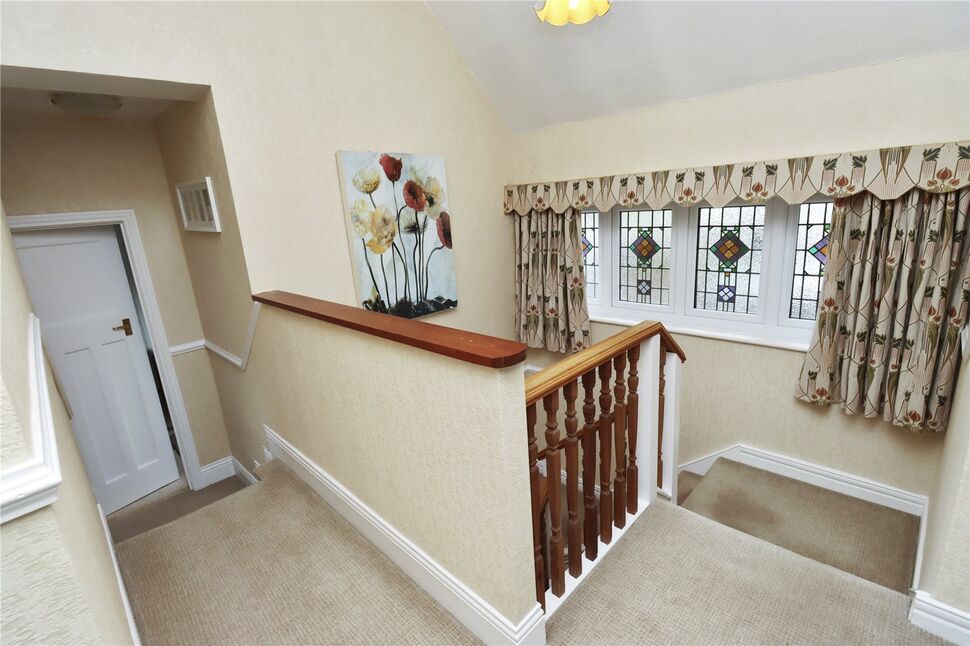 Via Oak spindled return staircase with feature double glazed leaded window to the front, dado rail, loft access being boarded and with pull down ladder and lighting and doors off to: