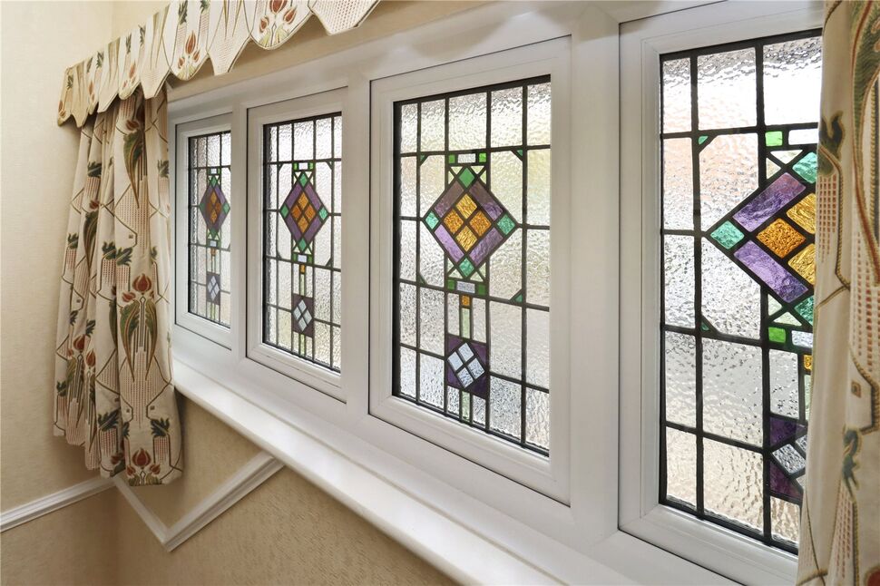 Leaded stained glass window, under stairs storage cupboard, radiator, dado rail, Oak wood spindled return staircase to first floor and doors off to: