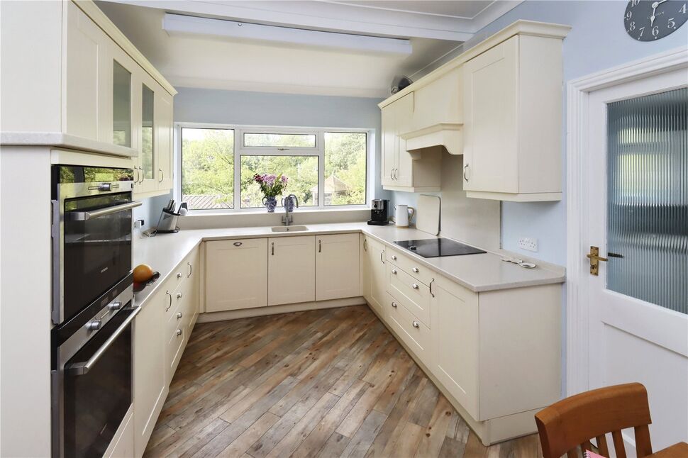Stylish cream wood cabinets with Granite work surfaces, integrated sink and drainer, built in double electric oven, electric hob with extractor above, integrated dish washer and fridge, double glazed window to the rear, radiator, coving to ceiling, Karndean flooring and wood and glazed door leading to: