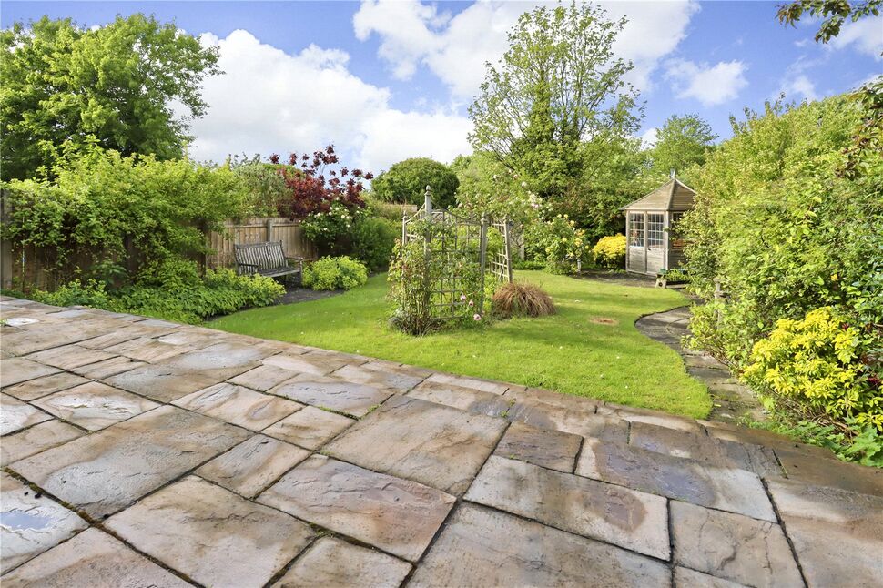 Rear garden- Fenced to sides and rear,paved patio terrace with steps down into garden with well stoked borders, mature trees and shrubs, rear patio area with wood hexagonal wooden summer house, mains water tap and lighting. Front garden- Half walled with cottage style planting.