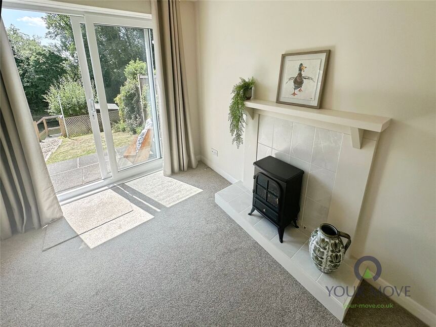 Tiled firs surround, with electric coal effect burner, radiator, double glaze window and further double glazed sliding patio doors leading to the garden