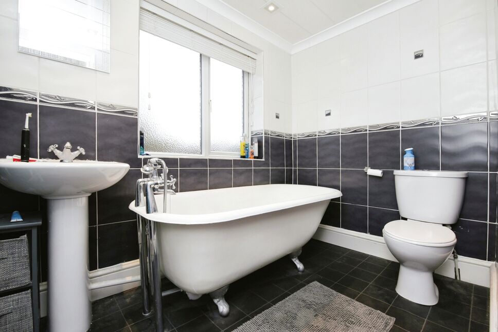 Self standing bath with shower head fixture, low level flush toilet and hand wash basin. Double glazed window and radiator.