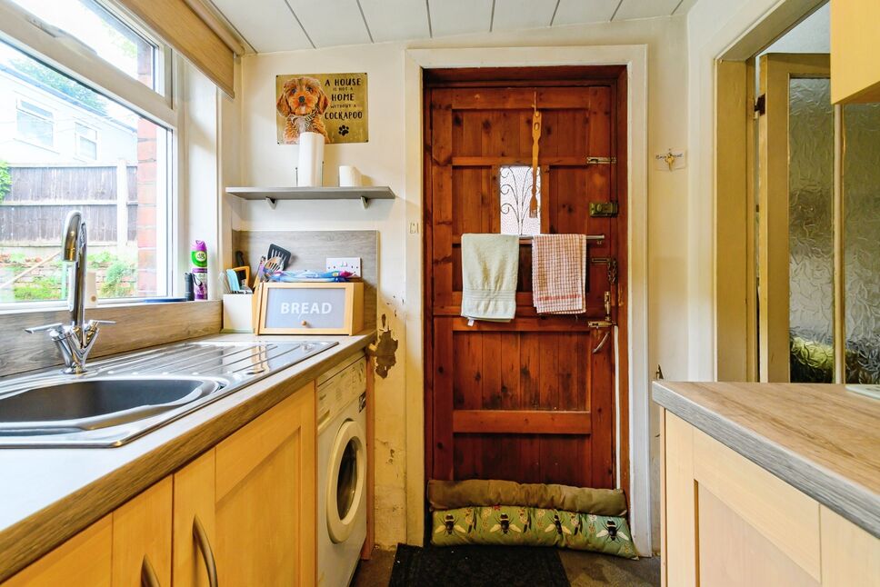 Feature fire place, electric fire, radiator, uPvc double glazed window to the rear elevation, door to the pantry, boiler, window to the side elevation.