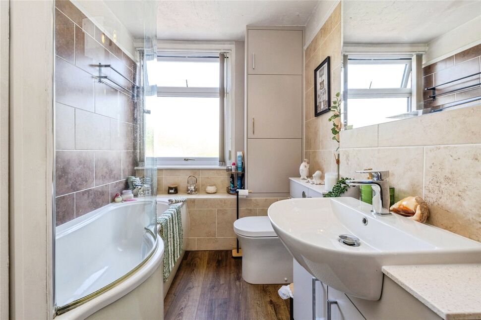 Modern family bathroom suite comprising a P-shaped bath with an overhead mains rainfall shower, vanity unit wash hand basin with quartz surface, low level WC, fitted wall mirror, radiator rail, storage cupboard home to the gas central heating boiler, partially tiled walls and a double glazed window to the rear aspect.