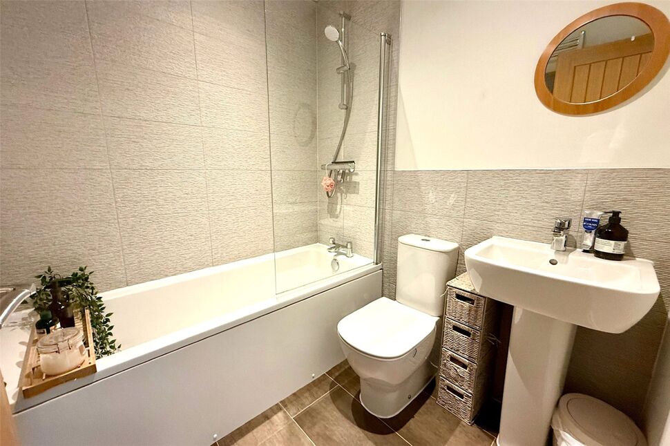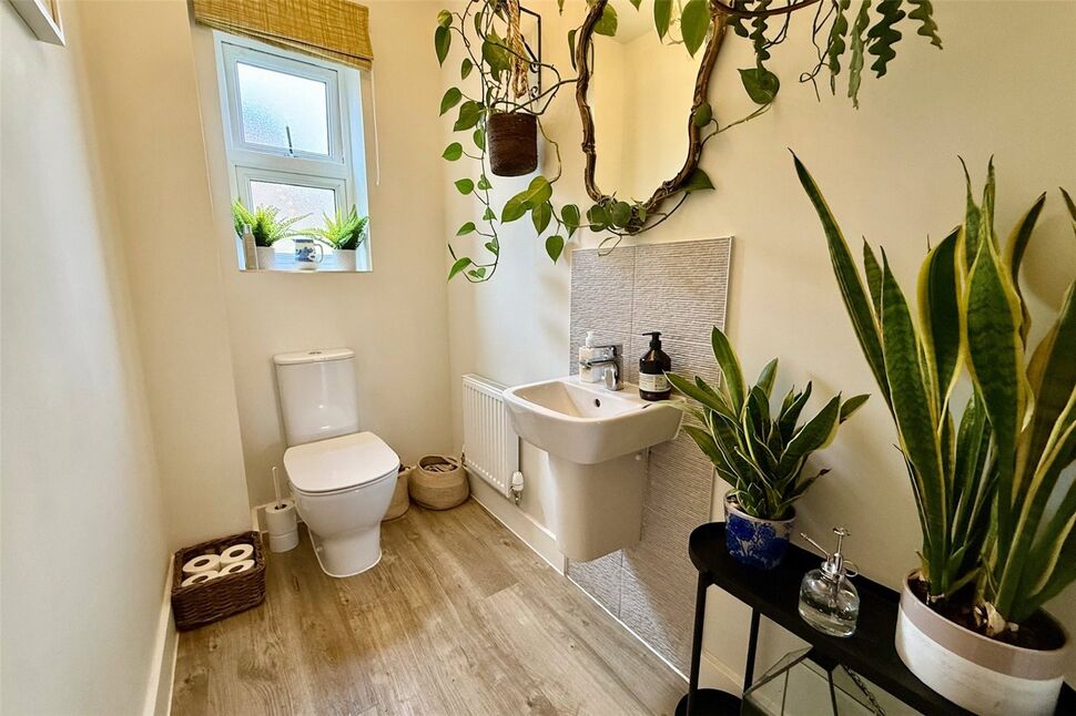 Comprising a modern white suite that includes a low-level WC and a wash basin with a central mixer tap. Additional features include a centrally heated radiator, tiled splashback, and an obscured UPVC double glazed window to the rear elevation.
