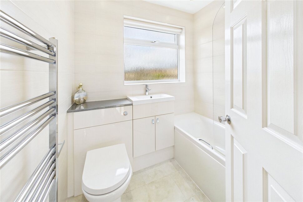 PVCu double glazed window to rear, panelled bath with shower over, wash hand basin with vanity unit below, low level w.c., fully tiled walls, towel rail radiator, extractor fan.