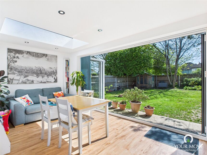 Bifold doors opening onto the garden plus a lantern, storage cupboards, down lights, opening to kitchen.