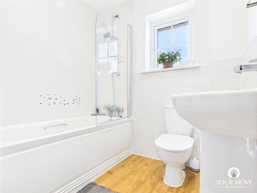 Obscured double glazed window to the front, panelled bath with shower attachment, pedestal wash basin, close coupled WC, heated chrome towel rail, down lights, extractor, cupboard housing the boiler, Karndean flooring.
