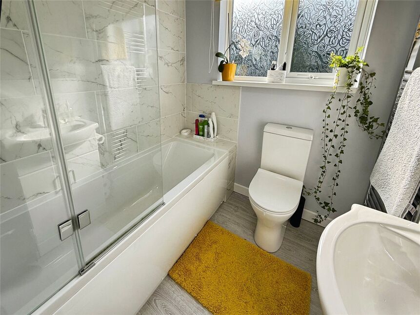 Modern and impeccably finished bathroom suite comprising a panelled bath with an overhead mains shower, pedestal wash hand basin, low level WC, partially tiled walls, extractor fan, radiator ail and a double glazed window to the rear aspect.