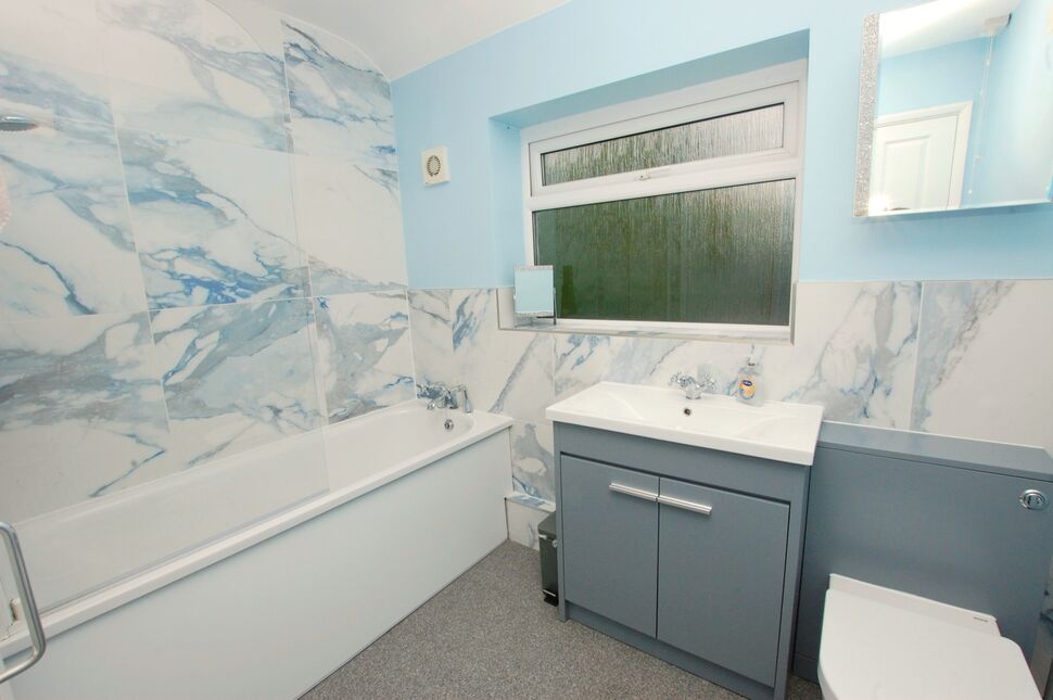 PVCu obscure double glazed window to rear, wc with concealed cistern, wash basin set within a vanity unit and an enamelled steel bath with over-bath shower. Radiator, built in cupboard with a wall mounted Potterton combination boiler serving the heating system and domestic hot water. recessed spot lights.