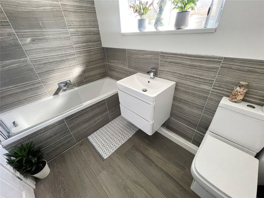 The family bathroom is very well presented comprising a; floating sink & storage unit, w.c & bath with a shower head for dual usage.