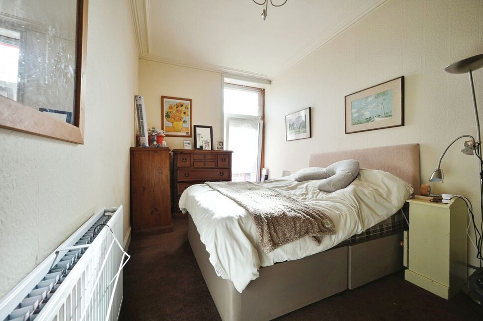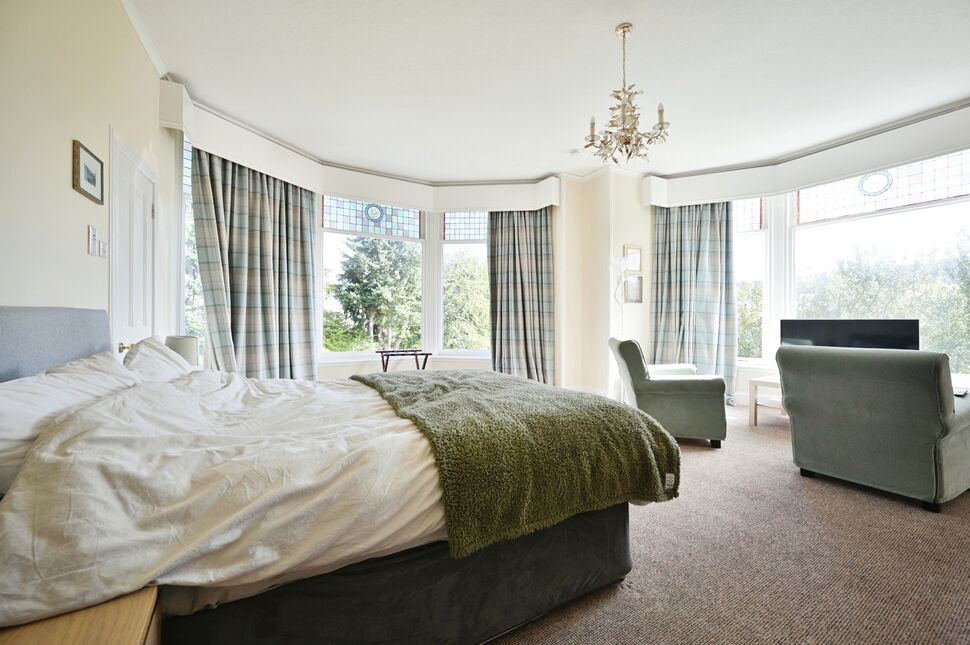 Generous double bedroom with double height bay windows and an ensuite shower room.